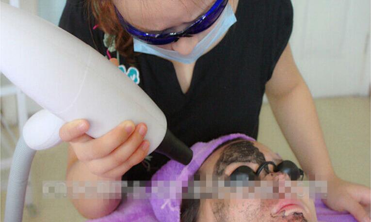 3.Spread specific medical carbon powder on face,after absolutely infiltrated in pores,then begin to shoot,it's very easily to burst the carbon particles then to break out pigments,cutin of epidermis.The heat will stimulate regrowth of collagen,then to tighten skin,shrink large pores.